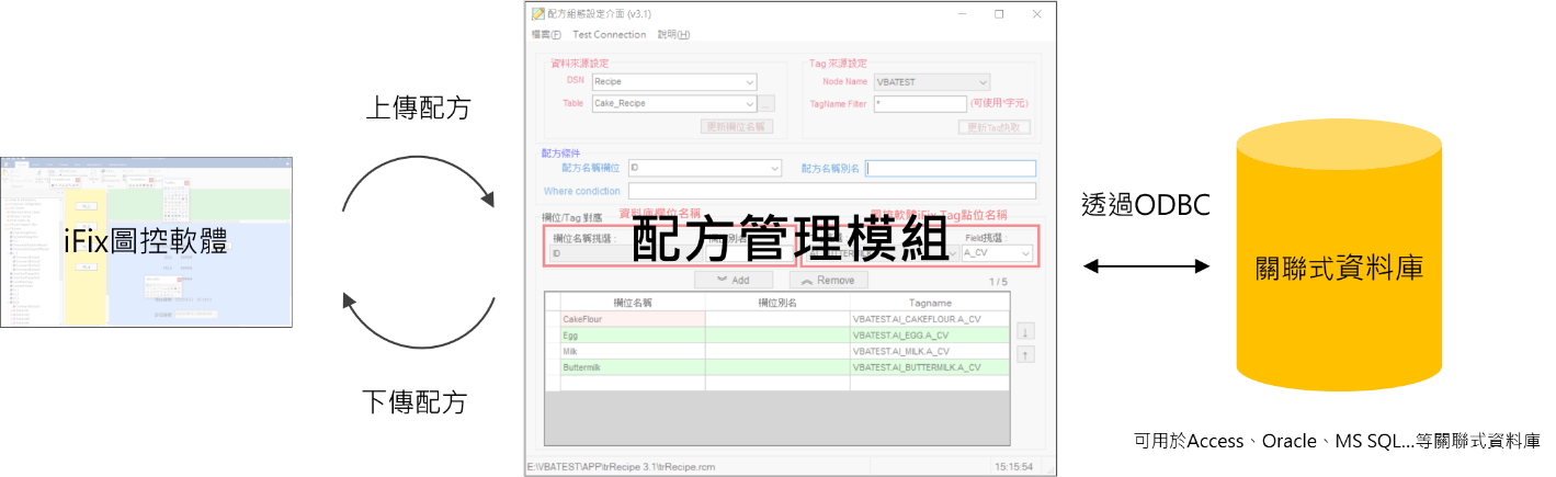 使用者僅需事先在關聯式資料庫中建立好配方的資料表,透過配方管理介面在關聯式資料庫中建立生產的配方組合,