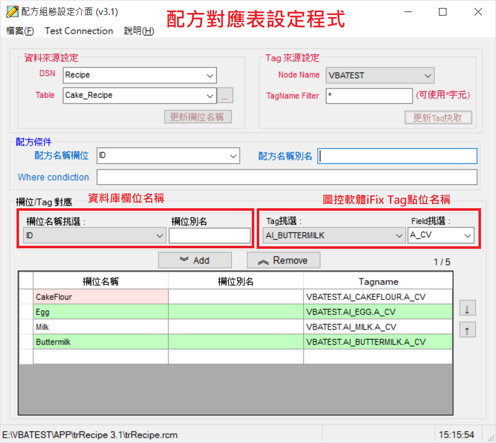 再打開「配方對應表設定」程式,建立iFix PDB的點位與資料庫欄位的對應表。
