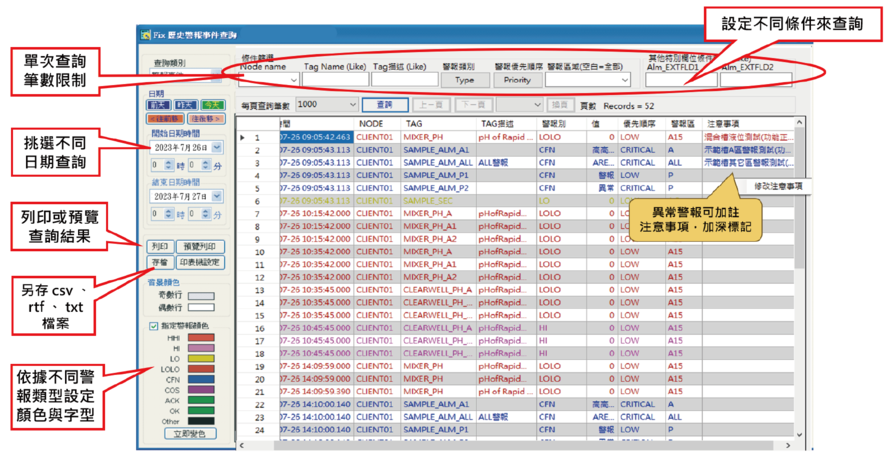 * 可設定不同的條件來查詢歷史警報事件、系統、操控資料。
