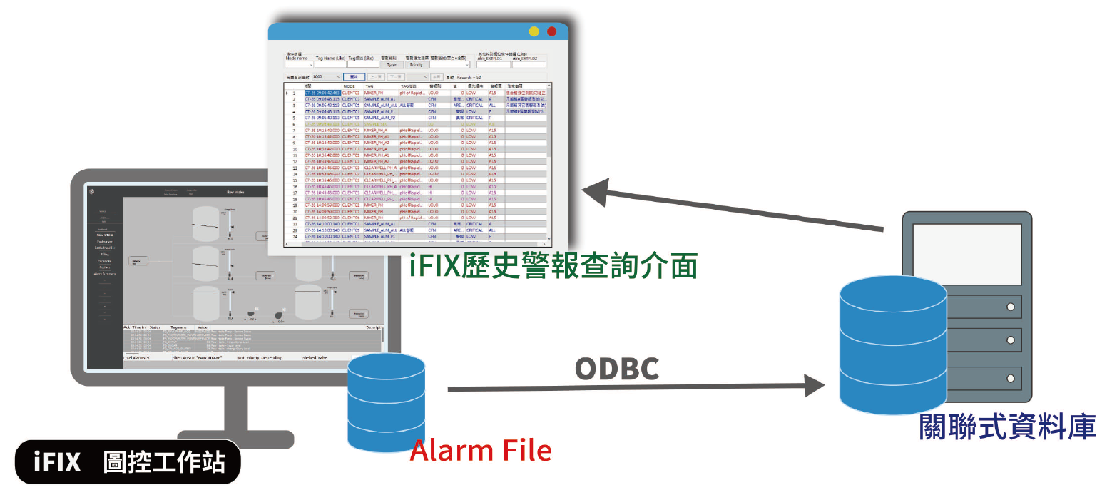 警報資料匯出至資料庫,再提供標準的iFIX圖庫系統之歷史警報分析查詢畫面,簡單又快速的安裝設定就能夠使用此一功能應用。