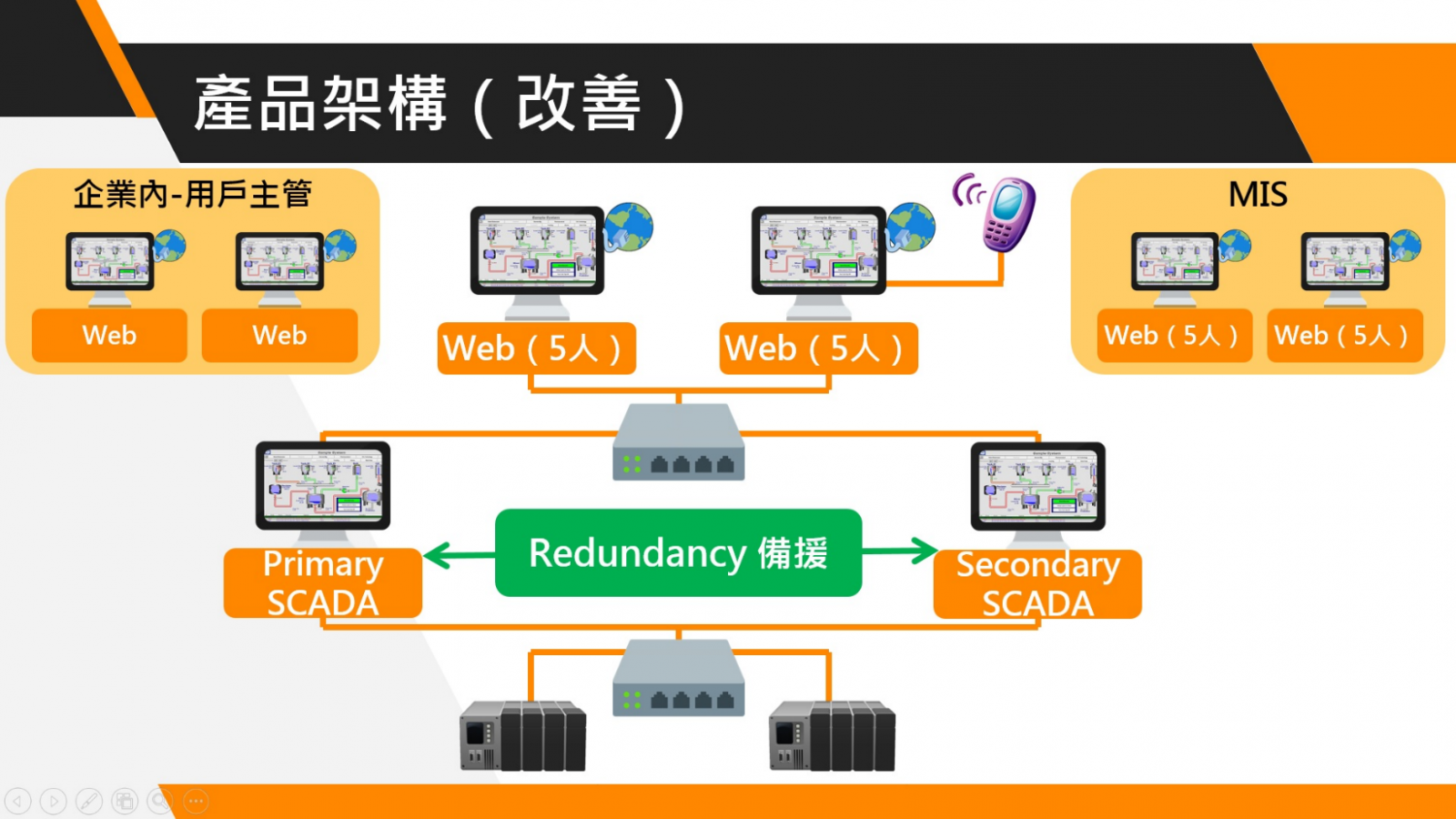 系統改善之成效- 搭配iFIX完整的自動備援運用,網路效能不受影響,當監控系統異常或當機時,圖控工作站可自動切換,不中斷監控系統功能,並能繼續記錄現場運轉資訊。