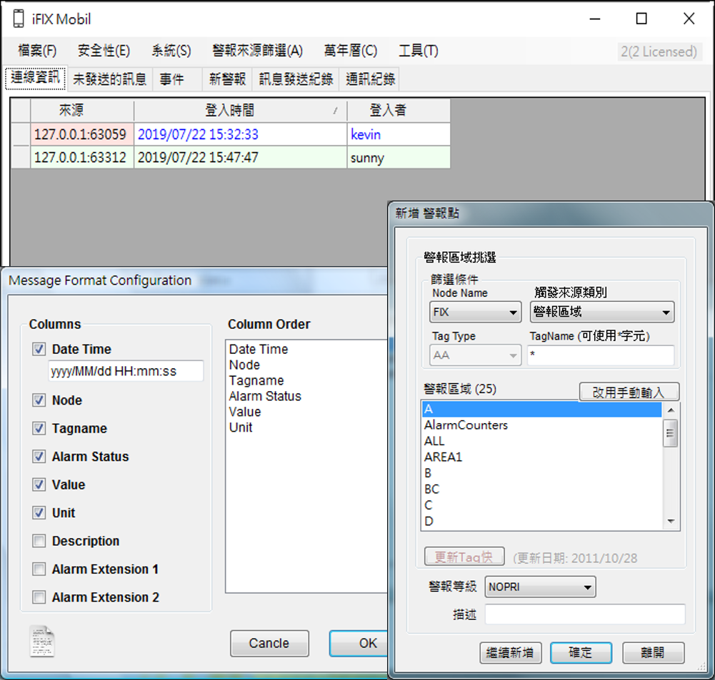 顯示目前連線到Server的Client端資訊、尚未發送的訊息之管理、提供事件紀錄查詢、新警報紀錄檢視介面、